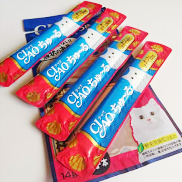 スティック状の小袋にはいっているので、開けたての美味しさを都度味わえるのはもちろん、猫ちゃんがそのまま舐めて食べる事ができます。この形状のおかげで、今までうつむきにお皿で食べていたのが、食べている様子を飼い主さんの目の前で見られるようになりました。とってもかわいい姿に飼い主さんも、猫ちゃんも夢中です。CIAOちゅ~るは、今まで無かった液状のおやつとして発売されました。食品原料を使い、まぐろやかつお、とりささみといった、猫ちゃんが好きな原料をペースト状にし、ペロペロなめて食べられるフードです。